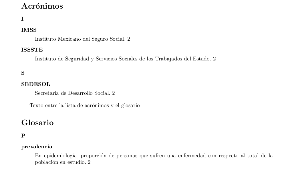 Ahora, en el texto del documento, es necesario indicar los acrónimos o palabra del glosario que se desea que aprezca el documento. Por ejemplo, si se quiere que se muestre el acrónico IMSS, o la palabra prevalencia del glosario, se debe indicar del siguiente modo: